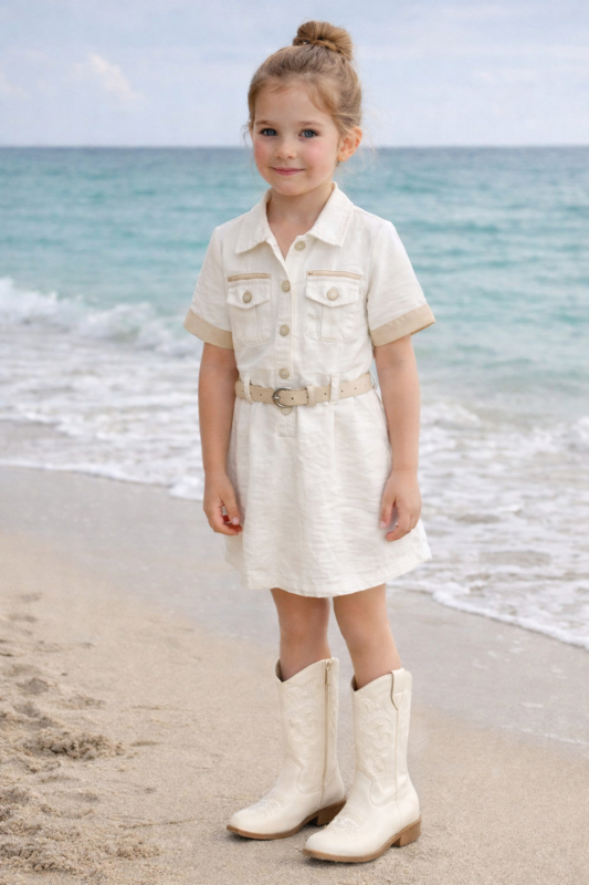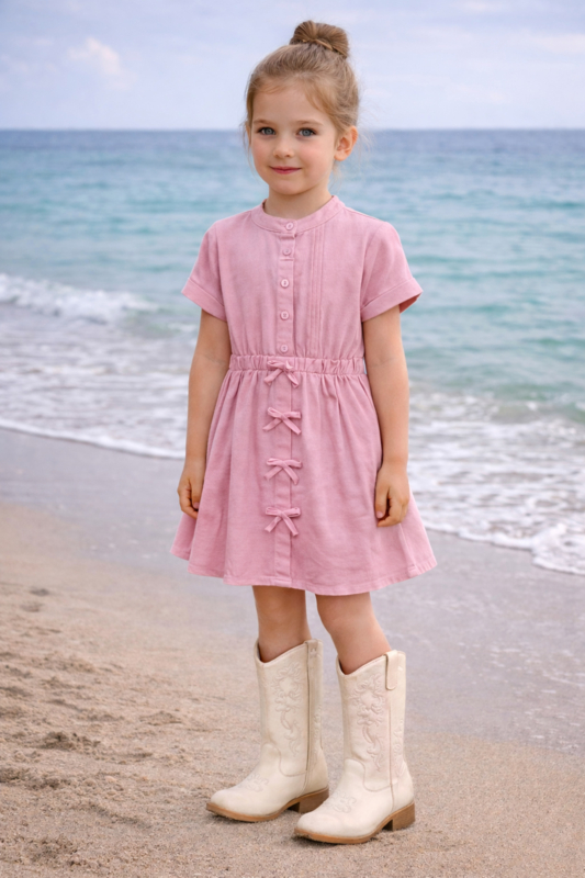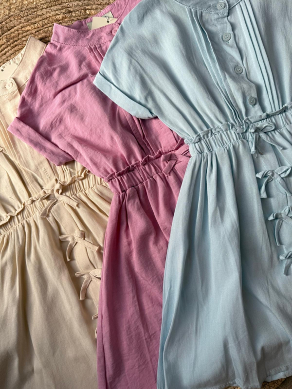 Mooi uitgewerkt jurkje met een mooie mouw en strikjes in het roze.