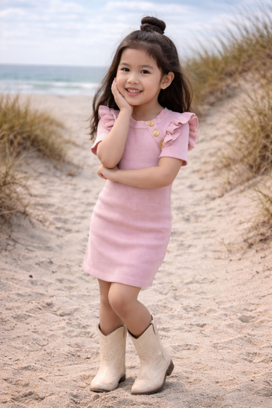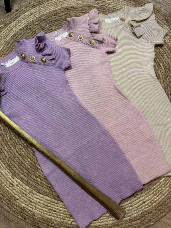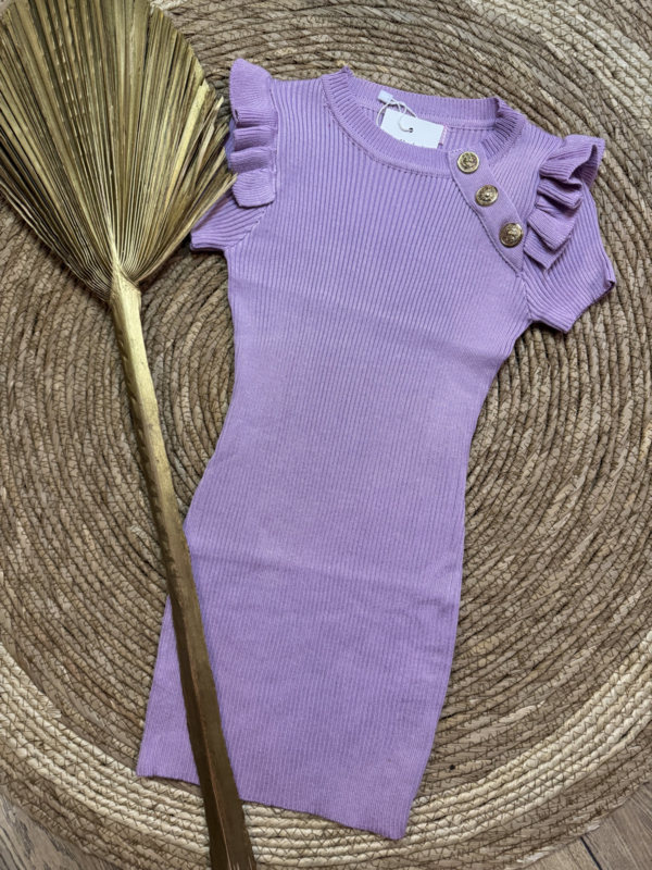 Fijn gebreide jurk met goudkleurige knopen in het lila.