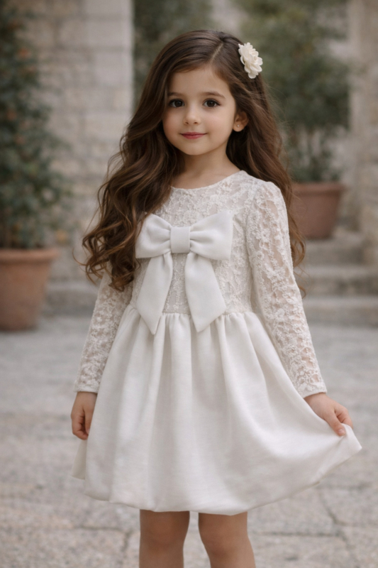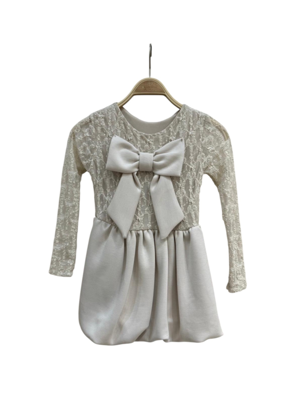 Mooi uitgewerkt ballon jurk met kant en strik in het zandkleur .