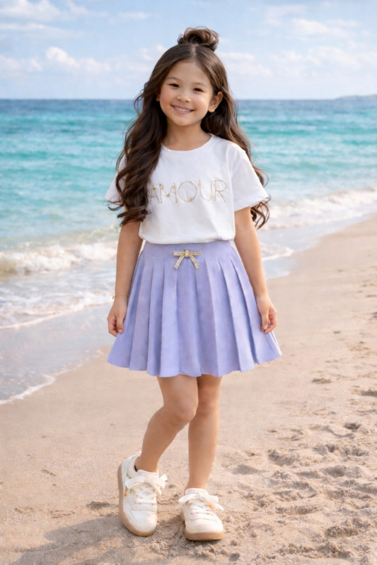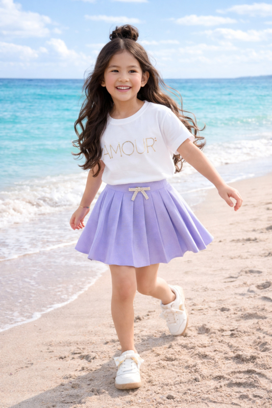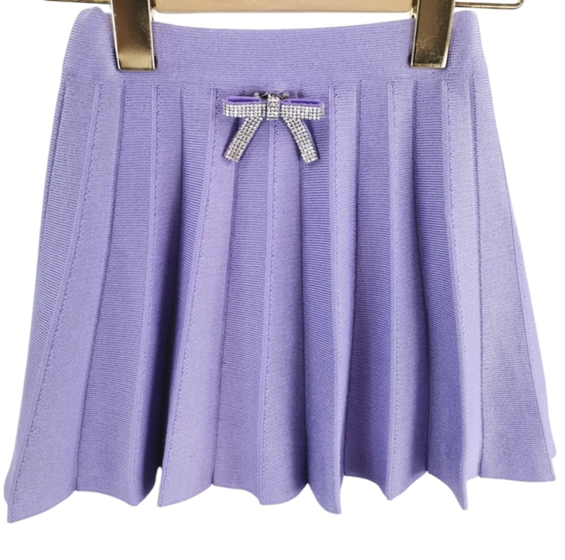 Fijn gebreid plooirokje in het lila met een mooie strik speld met strass sterntjes .