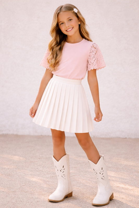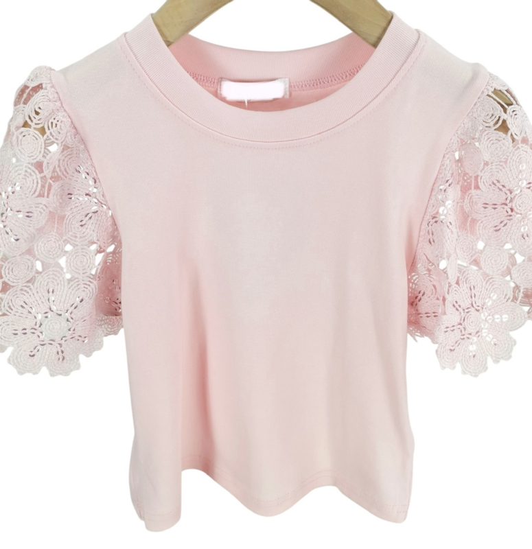 Mooi uitgewerkt shirtje met kanten mouwen in het lichtroze .